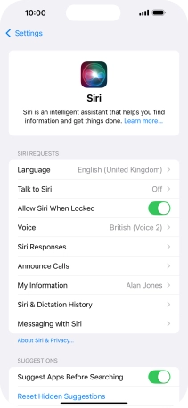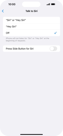 Press the required setting to turn the function on or off. If you turn on the function, you need to follow the instructions on the screen to set up Siri to recognise your voice.