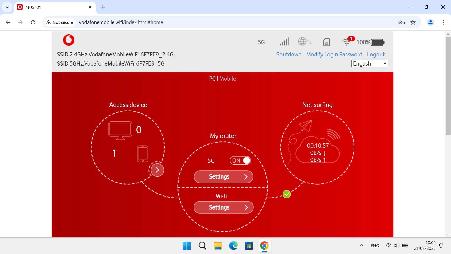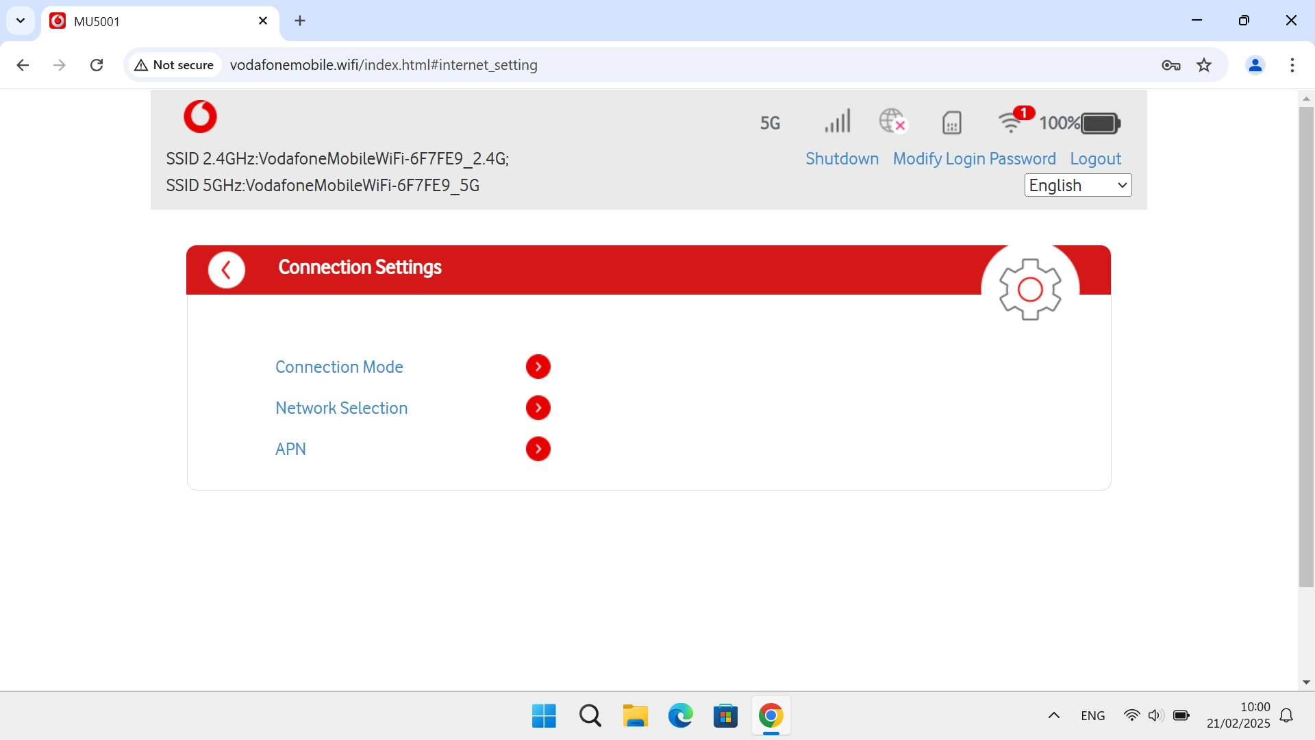 Turn data roaming on your Vodafone 5G Mobile Hotspot Windows 11 on or off