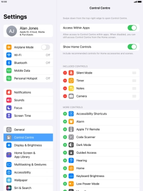 Press the add icon next to the required function to add it to Control Centre.