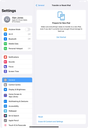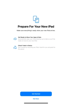 Press Get Started and follow the instructions on the screen to select the required settings and back up the tablet memory to iCloud. Once you've received your new iPad, you'll be able to restore the content of the iCloud backup.