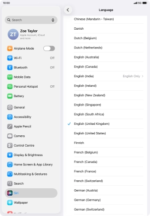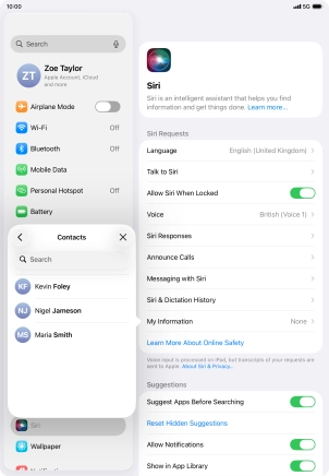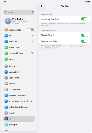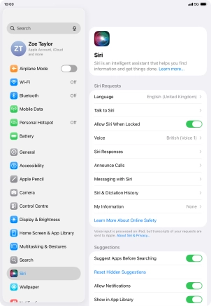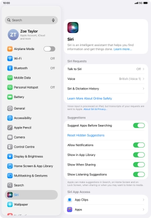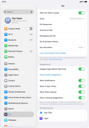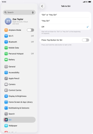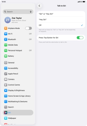 Press the required setting to turn the function on or off. If you turn on the function, you need to follow the instructions on the screen to set up Siri to recognise your voice.