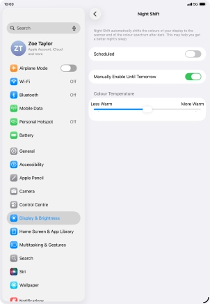 Press the indicator next to "Scheduled" to turn on the function and follow the instructions on the screen to select the required period of time for Night Shift.