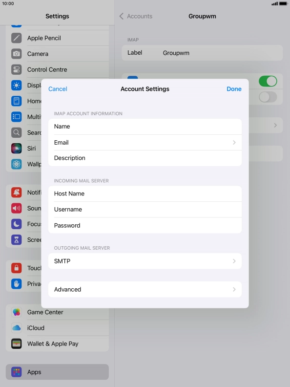 Press Username and key in the username for your email account.