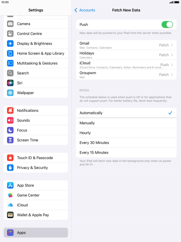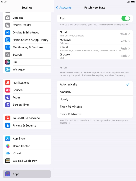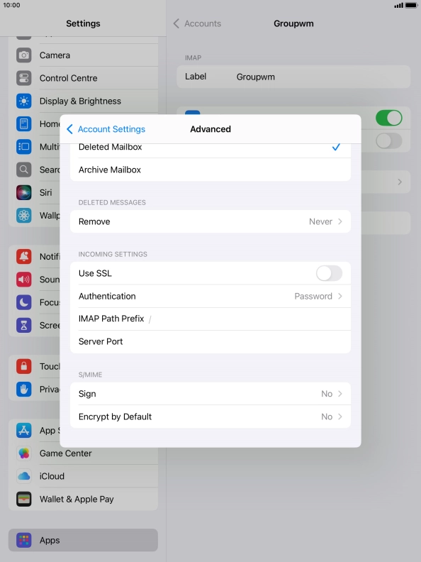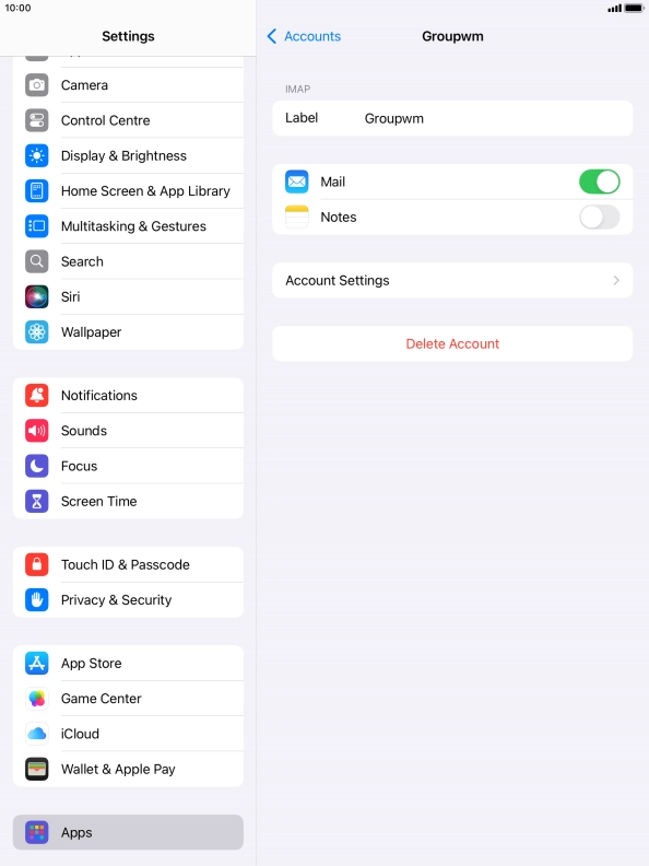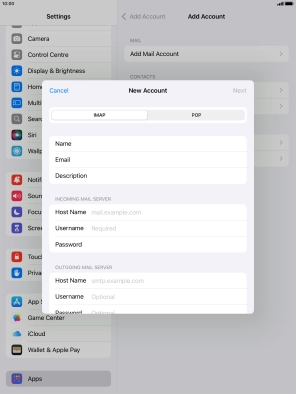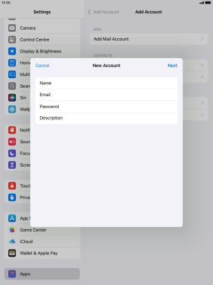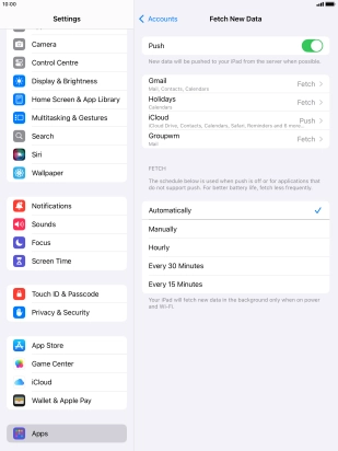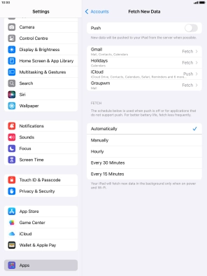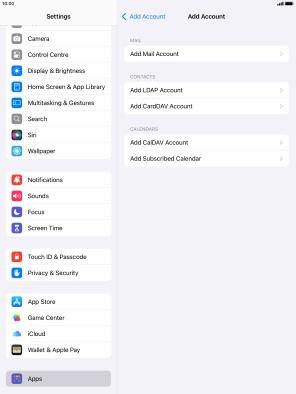 Press the required email account and follow the instructions on the screen to select settings for the specific account.