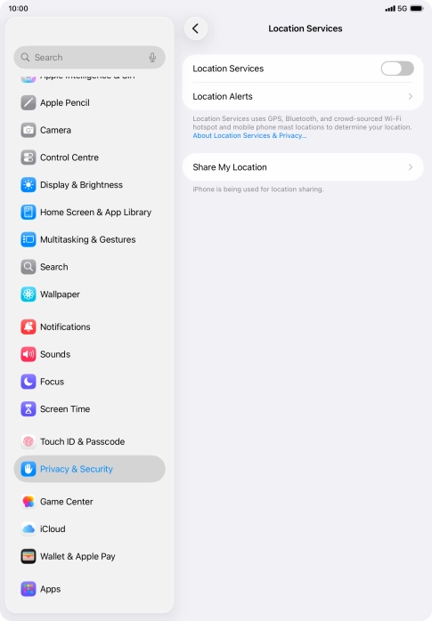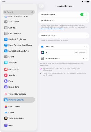 Press the indicator next to "Location Services" to turn the function on or off.