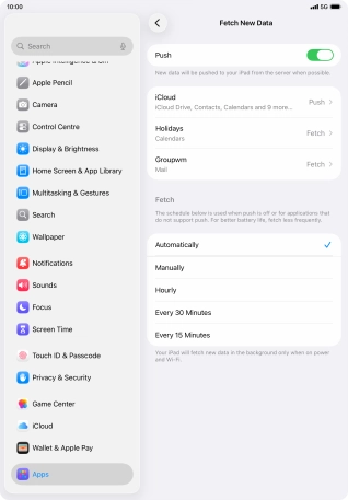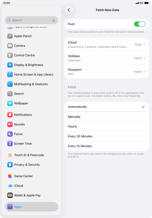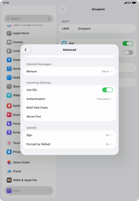 Press the required email account and follow the instructions on the screen to select settings for the specific account.