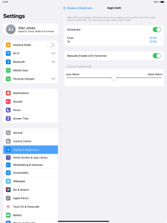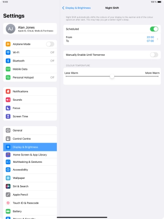 Press the indicator next to "Scheduled" to turn on the function and follow the instructions on the screen to select the required period of time for Night Shift.