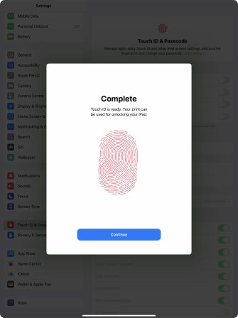 You can set your tablet to use your fingerprint as lock code or to authorise iTunes and App Store purchases. To use Touch ID, you need to turn on the lock code.