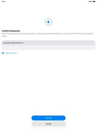 Key in the password for your Apple Account and press Turn Off. Wait a moment while the factory default settings are restored. Follow the instructions on the screen to set up your tablet and prepare it for use.