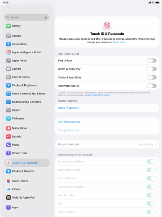 You can set your tablet to use your fingerprint as lock code or to authorise iTunes and App Store purchases. To use Touch ID, you need to turn on the lock code.