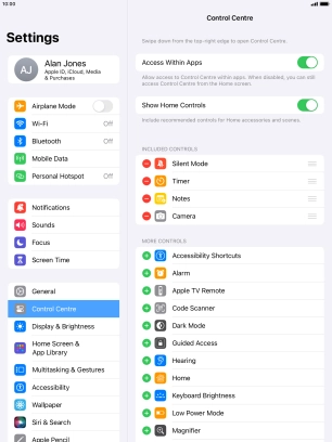 Select settings for Control Centre on your Apple iPad Air (2019) iPadOS 17