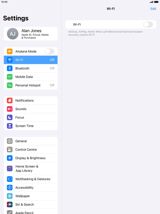 Press the indicator next to "Wi-Fi" to turn the function on or off.