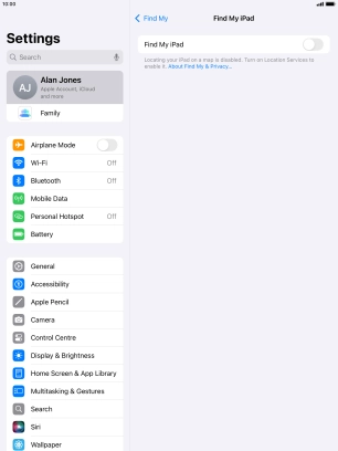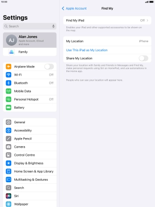 Select settings for Find My iPad on your Apple iPad Air (2019) iPadOS 18