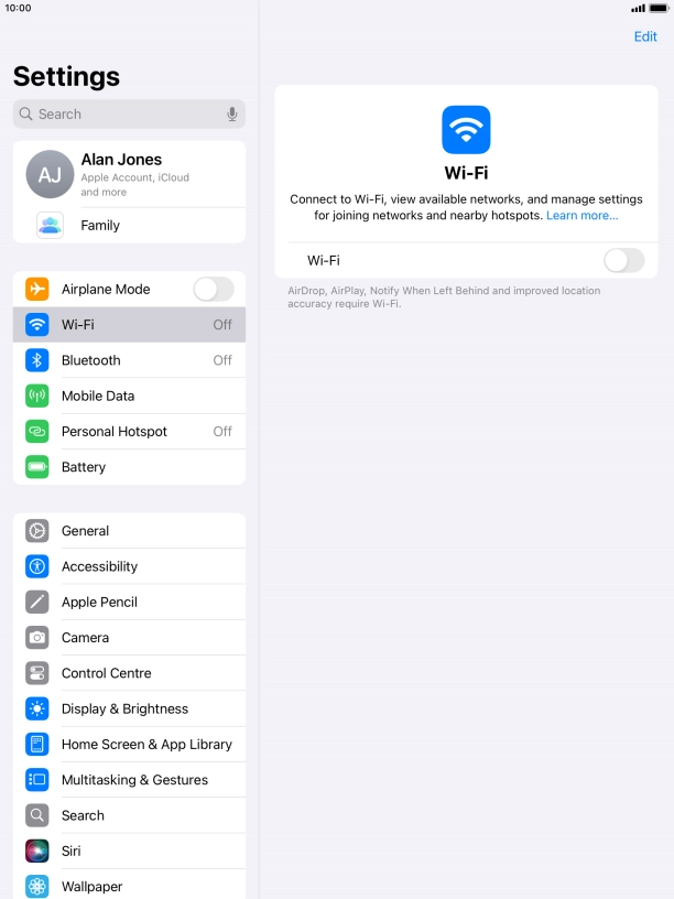 Press the indicator next to "Wi-Fi" to turn the function on or off.
