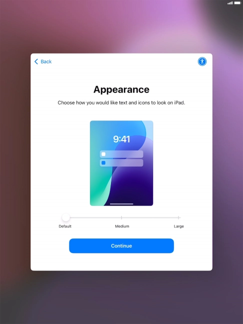 Select the required text and icon size on your tablet and press Continue.