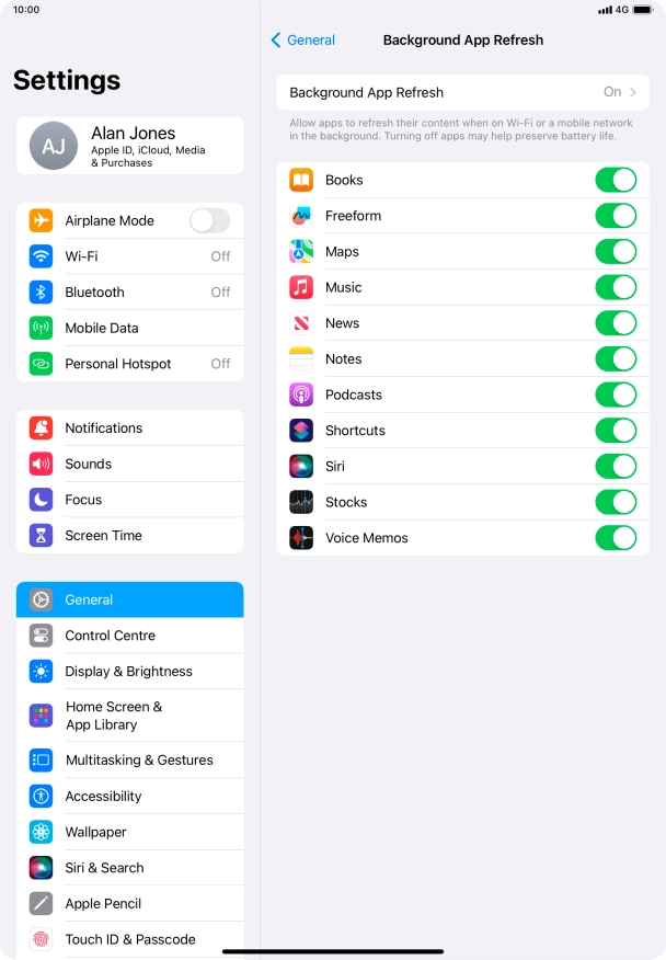 To turn on background refresh of apps using mobile network, press Wi-Fi & Mobile Data.