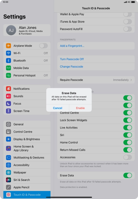 Press the indicator next to "Erase Data" to turn the function on or off.