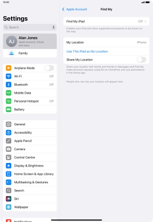Find My iPad enables you to find your tablet if you lose it or you can lock it should it get stolen. To select settings for Find My iPad, you need to activate your Apple ID on your tablet.