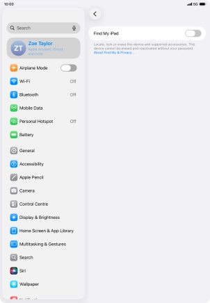 Select settings for Find My iPad on your Apple iPad Air (2020) iPadOS 26