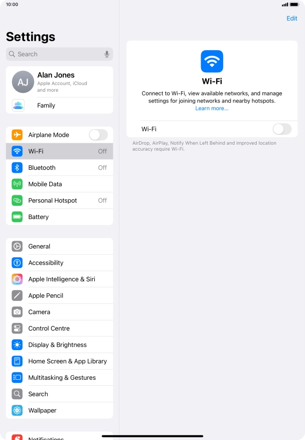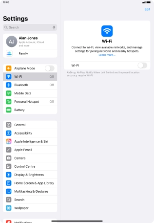 Press the indicator next to "Wi-Fi" to turn the function on or off.