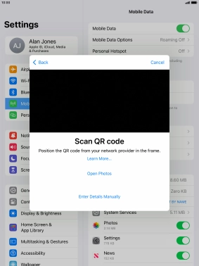 Place the QR code you've received inside the tablet camera frame to scan the code. Your eSIM is transferred to your new tablet over the internet.