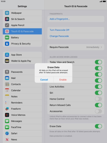 Press the indicator next to "Erase Data" to turn the function on or off.