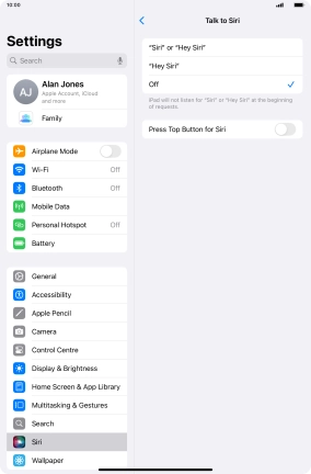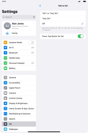 Press the required setting to turn the function on or off. If you turn on the function, you need to follow the instructions on the screen to set up Siri to recognise your voice.