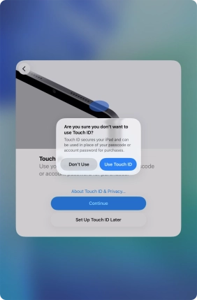 Follow the instructions on the screen to turn on use of Touch ID or press Set Up Touch ID Later.