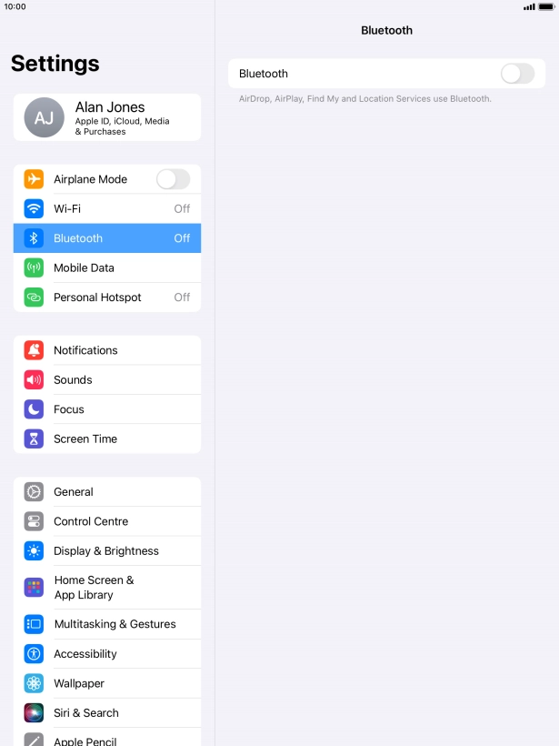 Press the indicator next to "Bluetooth" to turn the function on or off.