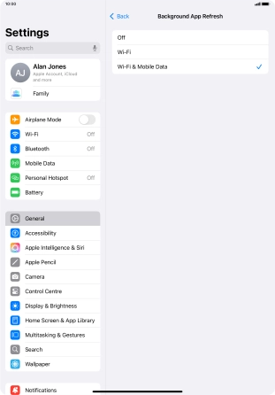To turn on background refresh of apps using mobile network, press Wi-Fi & Mobile Data.