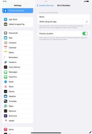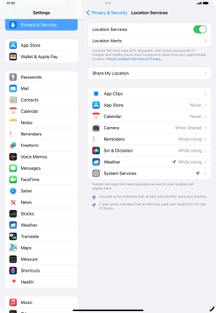 Press the indicator next to "Location Services" to turn the function on or off.