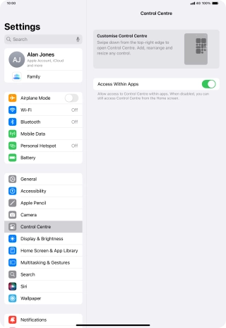 Using Control Centre, you can get quick access to selected functions on your tablet.