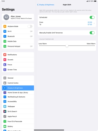 Press the indicator next to "Scheduled" to turn on the function and follow the instructions on the screen to select the required period of time for Night Shift.
