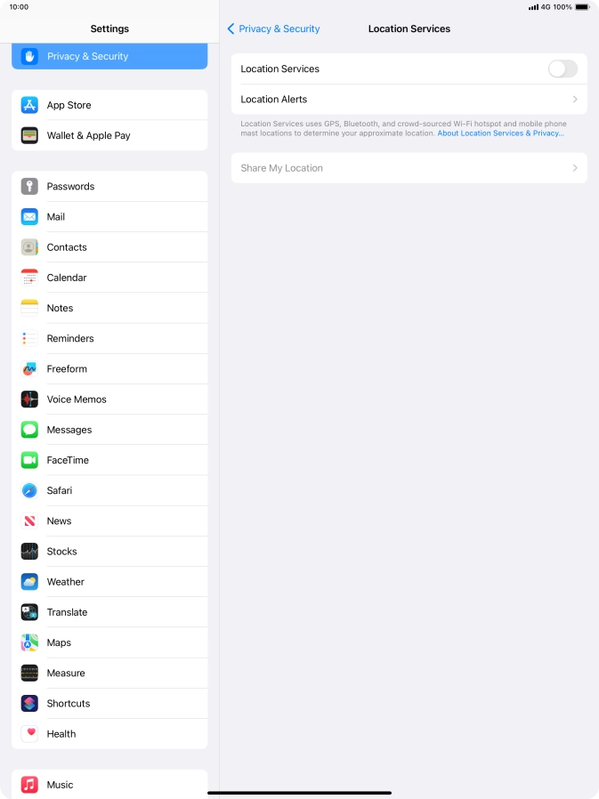 Press the indicator next to "Location Services" to turn the function on or off.