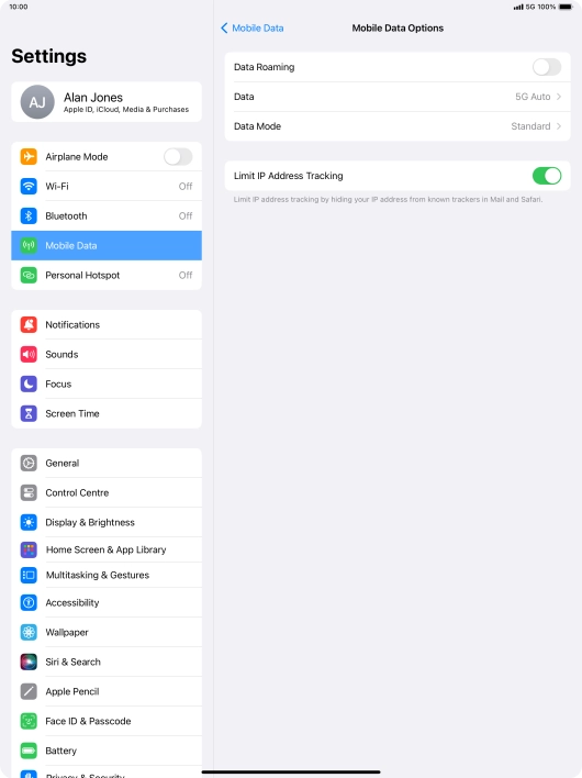 Press the indicator next to "Data Roaming" to turn the function on or off.