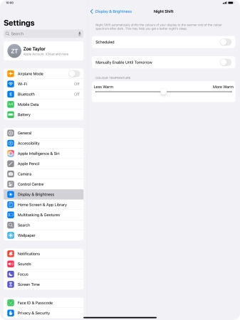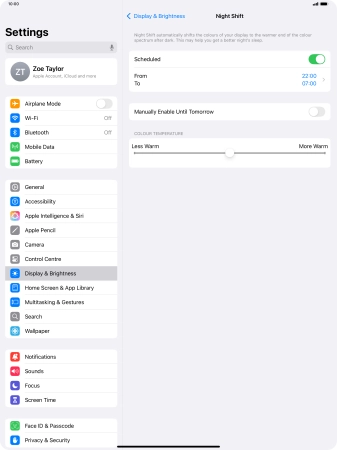 Select Night Shift settings on your Apple iPad Pro 13 (2024) iPadOS 18