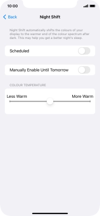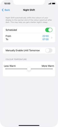 Press the indicator next to "Scheduled" to turn on the function and follow the instructions on the screen to select the required period of time for Night Shift.