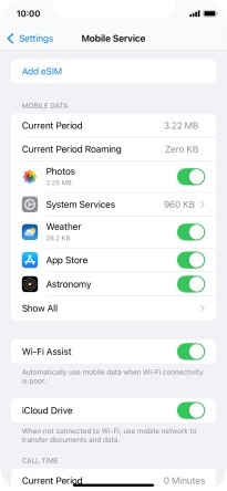 Press the indicator next to "Mobile Data" to turn the function on or off.