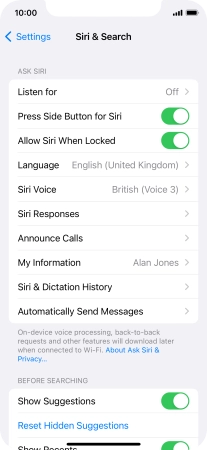 Press the required setting to turn the function on or off. If you turn on the function, you need to follow the instructions on the screen to set up Siri to recognise your voice.