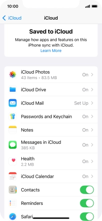 Press the indicators next to the required data types to turn synchronisation of each data type on or off.