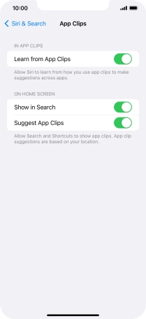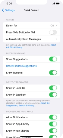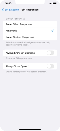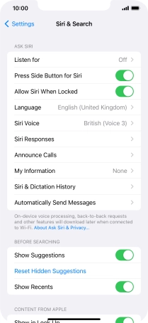 Press the required setting to turn the function on or off. If you turn on the function, you need to follow the instructions on the screen to set up Siri to recognise your voice.