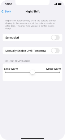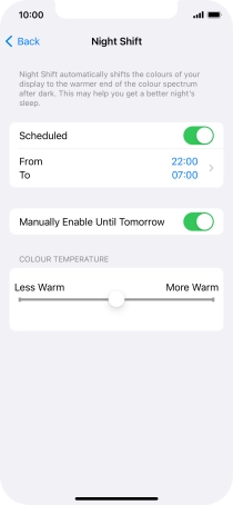 Press the indicator next to "Scheduled" to turn on the function and follow the instructions on the screen to select the required period of time for Night Shift.