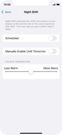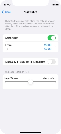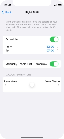 Press the indicator next to "Scheduled" to turn on the function and follow the instructions on the screen to select the required period of time for Night Shift.