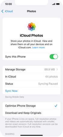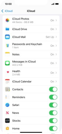 Press the indicators next to the required data types to turn synchronisation of each data type on or off.
