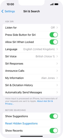 Press the required setting to turn the function on or off. If you turn on the function, you need to follow the instructions on the screen to set up Siri to recognise your voice.