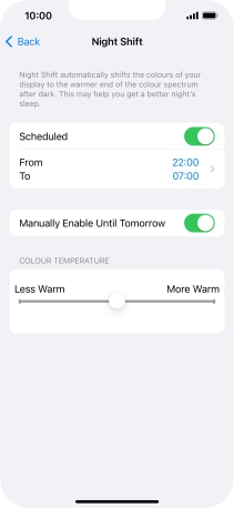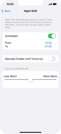 Press the indicator next to "Scheduled" to turn on the function and follow the instructions on the screen to select the required period of time for Night Shift.