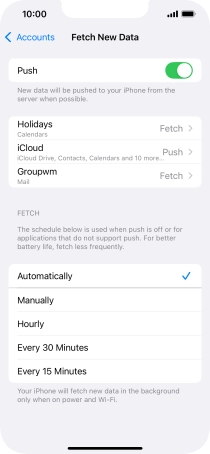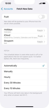 Press the required email account and follow the instructions on the screen to select settings for the specific account.