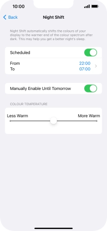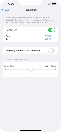 Press the indicator next to "Scheduled" to turn on the function and follow the instructions on the screen to select the required period of time for Night Shift.