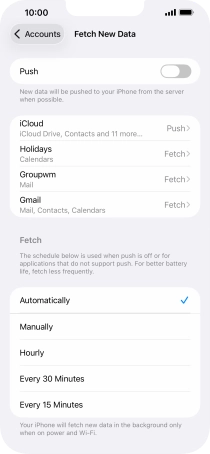 Press the required email account and follow the instructions on the screen to select settings for the specific account.