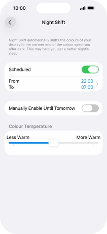 Press the indicator next to "Scheduled" to turn on the function and follow the instructions on the screen to select the required period of time for Night Shift.
